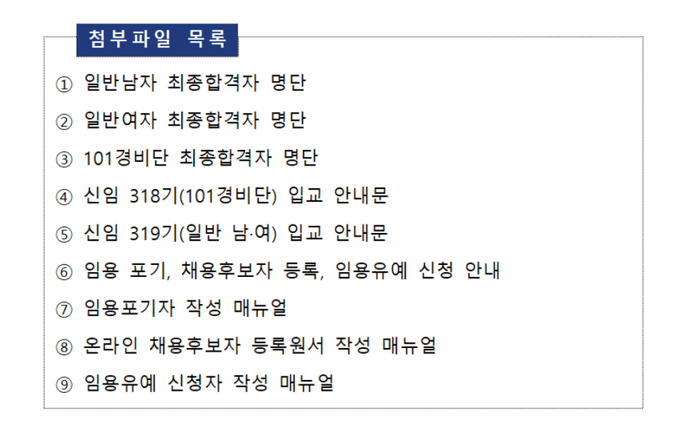 - 4. 신임 318기(101경비단) 입교 안내문.hwp – 101경비단 합격자를 위한 입교 일정, 복장, 준비물 등의 안내문입니다.