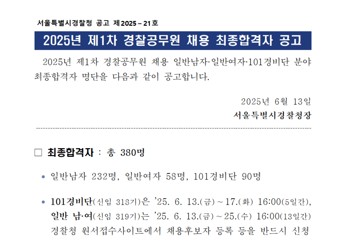 수험생 분들의 편의를 위해 아래에 경찰청 공식 채용공고 페이지로 연결되는 버튼을 제공합니다. 해당 페이지에서 ‘2025년 경찰공무원 1차 최종합격자 공고’를 확인하세요.