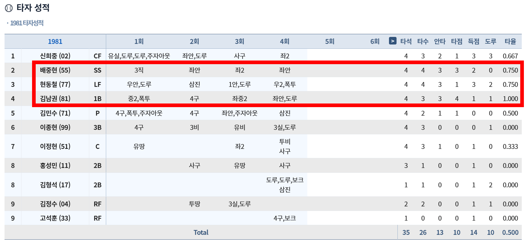 1981은 팀 전체 타율이 0.500(26타수 13안타)에 달할 정도로 타격감이 뜨거웠다. 특히 김남권(3타수 3안타, 4타점), 배중현(4타수 3안타, 3타점), 현동철(4타수 3안타, 1타점) 등이 맹타를 휘두르며 팀 승리를 이끌었다.