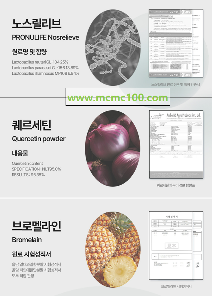 * 브로멜라인: 파인애플에서 추출한 천연 소화 효소로, 단백질 분해를 돕고 염증을 줄여줍니다. 콧물, 코막힘 완화에 효과적이며, 퀘르세틴과 함께 노즈픽션 효능을 높이는 역할을 합니다.