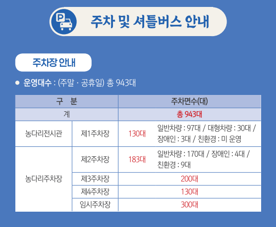 * 주차 공간: 약 943대 (주말 & 공휴일)