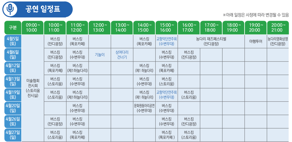 * 우천 등 기상 상황에 따라 일정 일부 변경 또는 취소될 수 있습니다.