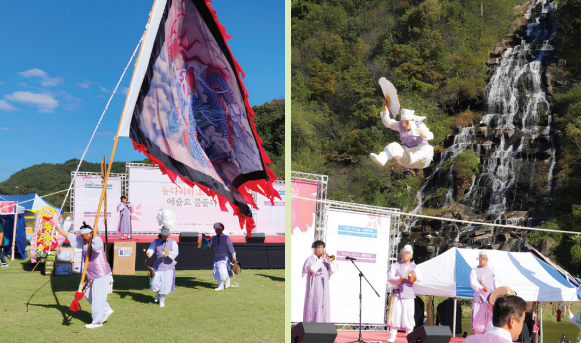 농다리 축제에는 대형 가수는 없습니다. 하지만 버스킹으로 지역 예술인들이 가수를 대신합니다.