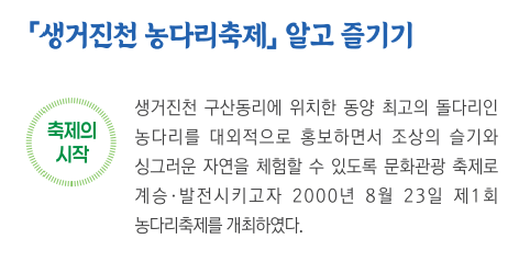따스한 봄바람이 살랑이는 충북 진천에서 2025년에도 어김없이 ‘생거진천 농다리 축제’가 개최됩니다! 천년의 역사를 품은 국내 최장 돌다리, 농다리를 배경으로 펼쳐지는 이 축제는 매년 풍성한 볼거리와 즐길 거리로 방문객들의 마음을 사로잡고 있죠.