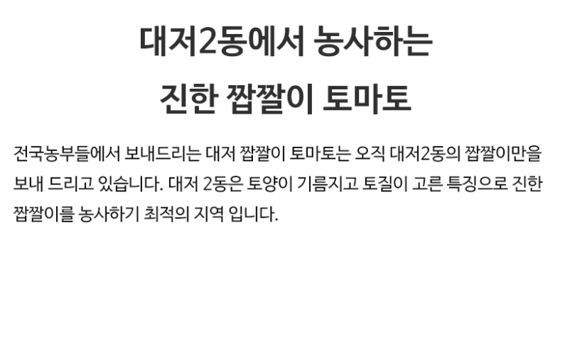 부산 강서구 대저동은 낙동강 하구의 비옥한 토양과 해풍 덕분에 토마토 재배에 최적의 조건을 갖추고 있습니다. 특히, 짭짤한 맛을 내는 토양에서 자라 '짭짤이 토마토'라는 애칭으로도 불리는데요. 이 독특한 환경이 만들어낸 특별한 맛 덕분에 대저토마토는 매년 봄, 전국적인 사랑을 받고 있습니다. 짭짤하면서도 달콤한 맛, 아삭한 식감은 일반 토마토와 비교불가! 한 번 맛보면 헤어나올 수 없는 마성의 매력을 지녔답니다. 대저토마토는 맛과 건강, 희소성까지 모두 갖춘 특별한 과일입니다. 대저토마토 효능을 제대로 느끼면서, 싱싱한 제철 대저토마토를 직거래로 저렴하게 구매하여 즐거운 봄을 맞이하세요!