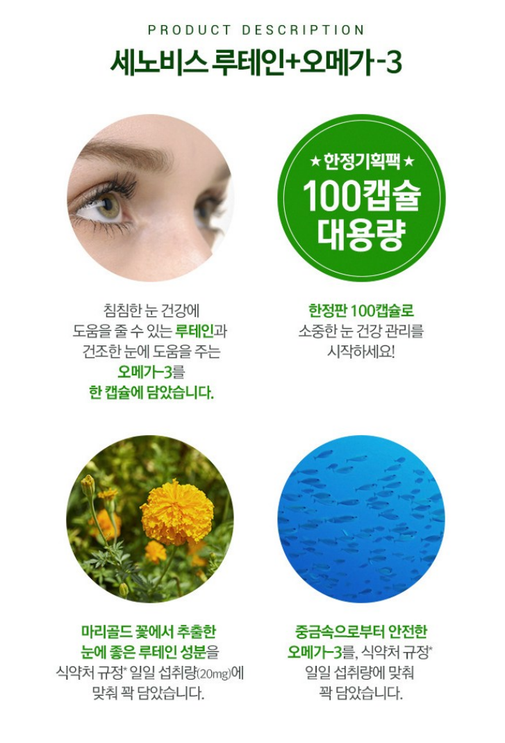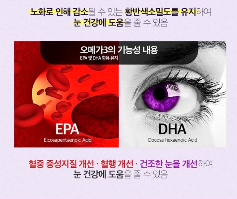 * 오메가-3 지방산: 눈의 건조함을 개선하고 염증을 완화하여 루테인의 흡수를 돕습니다.
