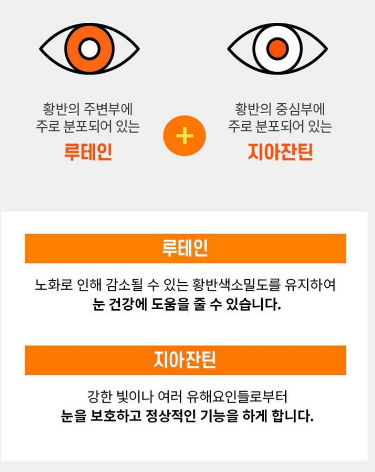 * 지아잔틴: 루테인과 함께 섭취하면 황반 건강에 시너지 효과를 냅니다.