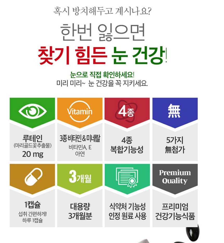 * 성분: 지아잔틴, 아스타잔틴, 비타민, 미네랄 등 추가 성분 함량을 확인하세요.