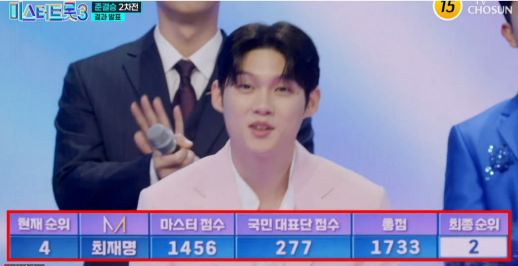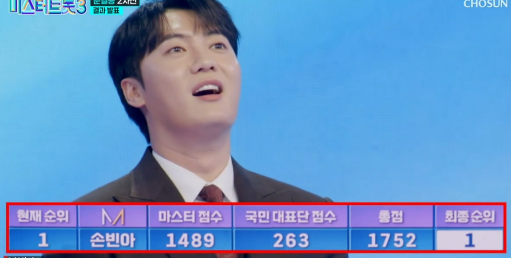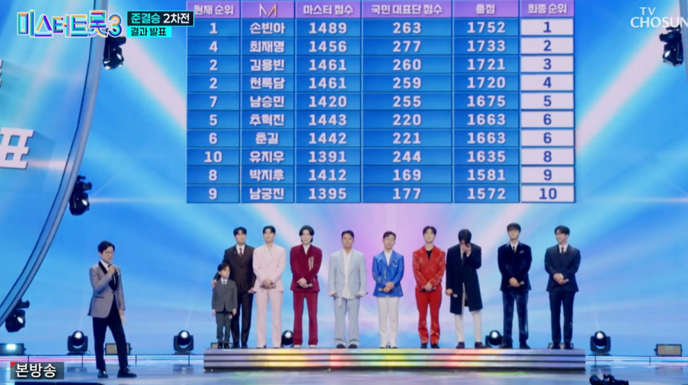 6일 방송된 '미스터트롯3' 준결승 2차전에서는 총 10명의 참가자 중 3명이 탈락하고 최종 TOP7이 결정되었습니다. 손빈아는 마스터 점수 1489점, 국민 대표단 점수 263점을 받아 총 1752점으로 1위를 기록했습니다. 이어 최재명이 2위에 오르며 결승 진출을 확정지었습니다.