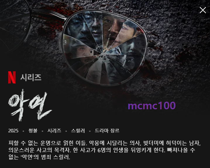 오랜만에 재미있는 드라마 한편 잘보고 갑니다. 개인마다 호불호가 있겠지만 우선 배우들이 개인적으로 좋아하는 배우들의 집합이여서 좋았다. 그것만으로 나에게는 바로봐야하는 이유였고 그 이유가 틀리지 않아서 좋았다. 넷플릭스 추천하고 싶은 또 하나의 드라마 악연. 지금 바로 시청해보세요