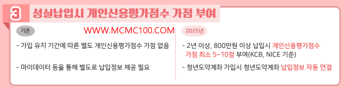 * 신용점수 가점 부여: 2년 이상, 총 800만 원 이상 납입할 때 신용평가점수 5~10점 가점 적용 (자동 반영)