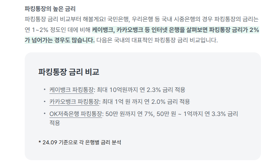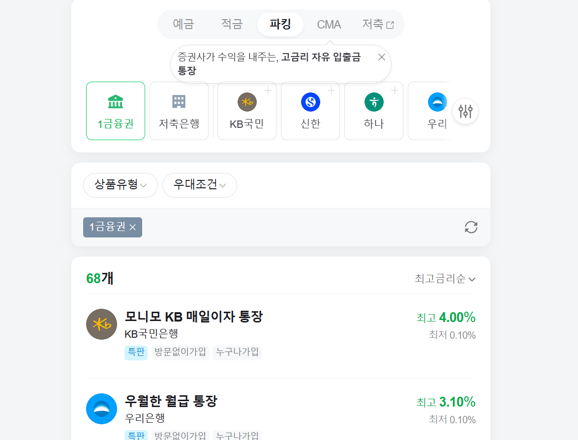 카카오뱅크, 케이뱅크 등 주요 시중은행의 파킹통장을 비교할 수 있고, 예금·적금·CMA 등 다른 금융상품 정보도 함께 확인 가능합니다. 실사용자 리뷰도 유용합니다.